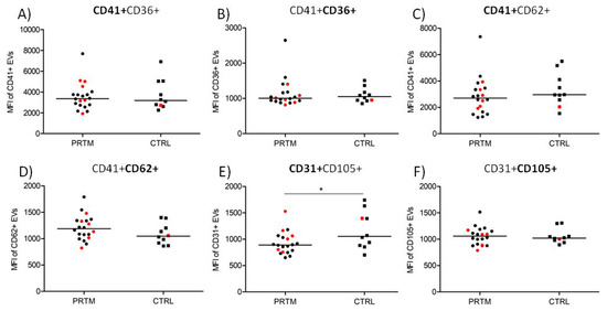 Comparison of median fluorescence intensity of labeled large EVs in cord blood plasma of PRTM and CTRL. Platelet (CD41+CD36+), activated platelet (CD41+CD62+), and endothelial (CD31+CD105+) EVs in preterm newborns (PRTM; circles, n = 20) and control newborns (CTRL; squares, n = 10) were analyzed. MFI of EVs labeled with CD41 PE (A), CD36 FITC (B), CD41 FITC (C), CD62 PE (D), CD31 FITC (E), and CD105 PE (F) are presented. Red symbols represent hemolytic samples (Hb > 0.1 mg/mL). The medians are shown. * p < 0.05.