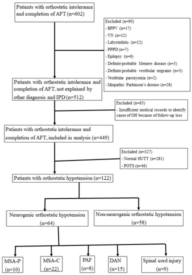 Flowchart for the inclusion and exclusion of patients for analysis. AFT: autonomic function test; IPD: idiopathic Parkinson’s disease; PPPD: persistent postural-perceptual dizziness; BPPV: benign paroxysmal positional vertigo; VN: vestibular neuritis; OH: orthostatic hypotension; HUTT: head-up tilt test; POTS: postural orthostatic tachycardia syndrome; MSA: multiple system atrophy; PAF: pure autonomic failure; DAN: diabetic autonomic neuropathy.