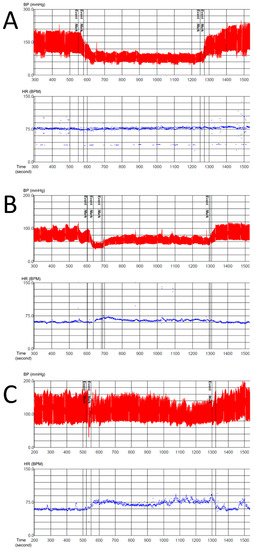 Representative examples of neurogenic OH (A,B) and non-neurogenic OH (C). A 63-year-old man clinically diagnosed with MSA-C exhibited typical NOH with high a PP reduction ratio (0.73) during the HUTT (A, vertical scale: 30 mmHg, horizontal scale: 100 s in upper row, vertical scale: 15 BPM, horizontal scale: 100 s in lower row). A 66-year-old woman clinically diagnosed with spinal cord injury exhibited typical NOH with a high PP reduction ratio (0.6) during the HUTT (B, vertical scale: 20 mmHg, horizontal scale: 100 s in upper row, vertical scale: 15 BPM, horizontal scale: 100 s in lower row). A 57-year-old man with hematemesis and anemia exhibited typical non-neurogenic OH with a low PP reduction ratio (0.4) during the HUTT (C, vertical scale: 20 mmHg, horizontal scale: 100 s in upper row, vertical scale: 15 BPM, horizontal scale: 100 s in lower row). BP: blood pressure; HR: heart rate; BPM: beats per minute; MSA-C: multiple system atrophy—cerebellum; OH: orthostatic hypotension; NOH: neurogenic orthostatic hypotension; PP: pulse pressure; HUTT: head-up tilt test.
