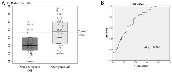 Pulse pressure reduction ratio (A) for each orthostatic hypotension subtype. Receiver operating characteristic (ROC) curve (B) for predicting high pulse pressure reduction ratio as a marker of neurogenic orthostatic hypotension. p: pulse pressure; OH: orthostatic hypotension; AUC: area under the curve.