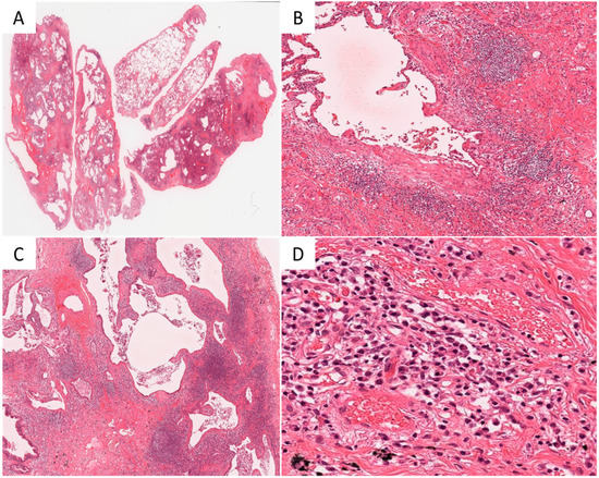 - Cipriani, N.A.; Strek, M.; Noth, I.; Gordon, I.O.; Charbeneau, J.; Krishnan, J.A.; Krausz, T.; Husain, A.N. Pathologic quantification of connective tissue disease-associated versus idiopathic usual interstitial pneumonia. Arch. Pathol. Lab. Med. 2012, 136, 1253–1258. [Google Scholar] [CrossRef] [PubMed] [Green Version]