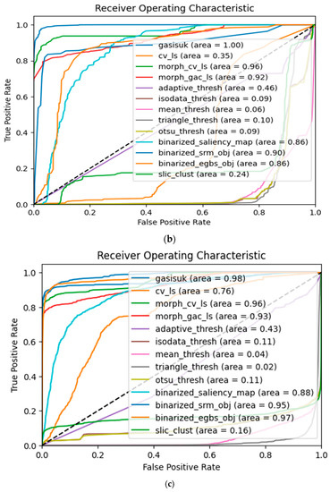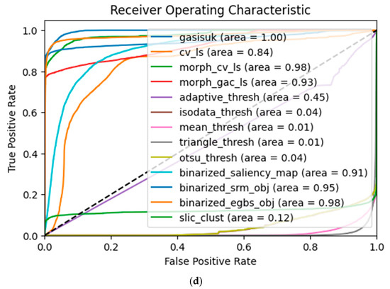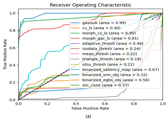 The receiver operating characteristic (ROC) curve in Figure 1a–d illustrates the potential and effectiveness of our proposed algorithm. It has achieved a compelling area under the ROC curve (AUC) of 1.00 on benign lesion images from both PH2 and ISIC datasets. Similarly, an AUC result of 0.99 was respectively recorded for PH2 malignant and 0.98 for ISIC malignant lesion images. As illustrated in [74], we have considered an AUC value of a minimum of 0.70 acceptable and an AUC between 0.80 and 0.90 as excellent, while results over 0.90 are considered outstanding. The top-performing algorithms with a minimum AUC of 0.90 on both PH2 and ISIC datasets were Morphology ACWE, Morphology GAC, and the proposed GASISUK algorithm. Both Otsu and mean thresholding algorithms performed the worst on PH2 malignant lesion images, with an approximated value of 0.22 in the AUC result. Similarly, both Otsu and triangle thresholding reported the least-performing results for PH2 benign lesion images. The ISODATA thresholding, mean thresholding, triangle thresholding, Otsu thresholding, and simple linear iterative clustering performed the least on both ISIC malignant and benign lesion images. Statistical region merging (SRM) has performed well on both PH2 and ISIC benign lesion images, with AUC values of 0.90 and 0.95, respectively, though it has performed poorly when evaluated over malignant PH2 datasets. The efficient graph-based image segmentation (EGBS) appeared to be able to trace lesion boundaries of most ISIC datasets for both malignant and benign, reporting AUC values of 0.97 and 0.98 for malignant and benign lesion images, respectively. It was observed that EGBS has performed excellently on benign PH2 images, but poorly on malignant PH2 lesion images, like the behavior seen in SRM. The saliency detection method gave good results on benign ISIC lesion images and performed excellently on malignant ISIC lesion images.