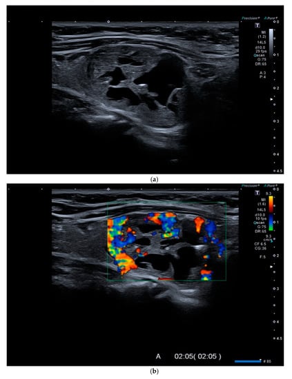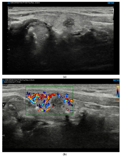 - Moon, H.J.; Kwak, J.Y.; Kim, M.J.; Son, E.J.; Kim, E.-K. Can Vascularity at Power Doppler US Help Predict Thyroid Malignancy? Radiolology 2010, 255, 260–269. [Google Scholar] [CrossRef] [PubMed]