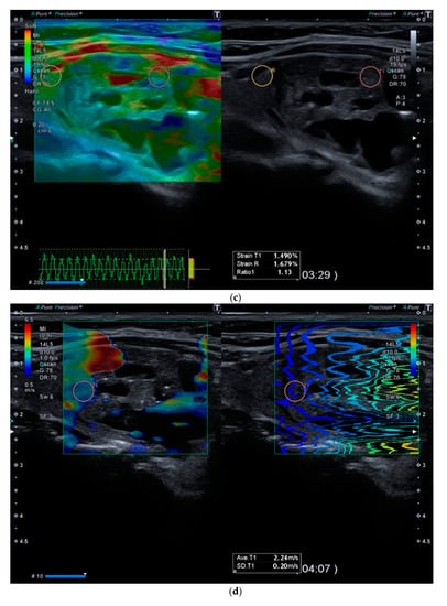In recent years, several studies have proposed the potential use of new ultrasound techniques such as CEUS (contrast-enhanced ultrasound) and, especially, USE (US-elastography) to increase the accuracy of baseline US [18,19] (Figure 1a–d and Figure 2a–e) (Table 1). CEUS was postulated as a means to accurately evaluate the dynamic qualitative and quantitative intensity of tumor perfusion and vascularity, which could be useful for identifying malignant tumors [18].
