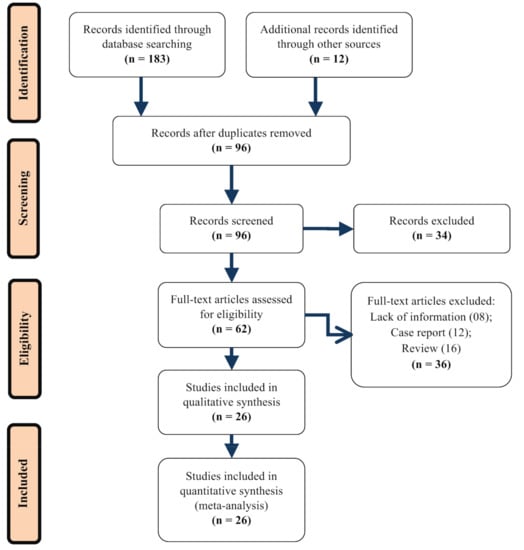 Initially, our meta-analysis search terms identified a total of 195 relevant articles. From these articles, we excluded 99 duplicate references and considered the remaining 96. By careful screening of the title and abstract, we excluded 34 articles based on the criteria noted above (e.g., case reports and review reports were ignored) and only considered full-text papers that examined comorbidity and clinical symptoms on COVID-19 patients as listed in Table 1. Finally, for the remaining articles, we reviewed the full text and further removed 36 studies as they were either reviews or clinical details lacking editorials. A total of 26 articles eventually met the inclusion criteria for our meta-analysis. A flow diagram of literature screening is shown in Figure 1.