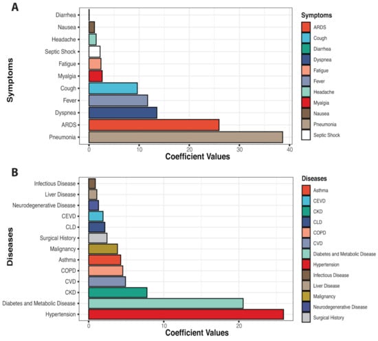 Machine learning models predict the important symptoms and comorbidities that are associated with the severity or death of COVID-19 patients. The high coefficient values of ML model outcomes mean the higher significant association of death. (A) represents the significance of symptoms that are linked with death; (B) represent the significance of disease comorbidities that are linked with death.
