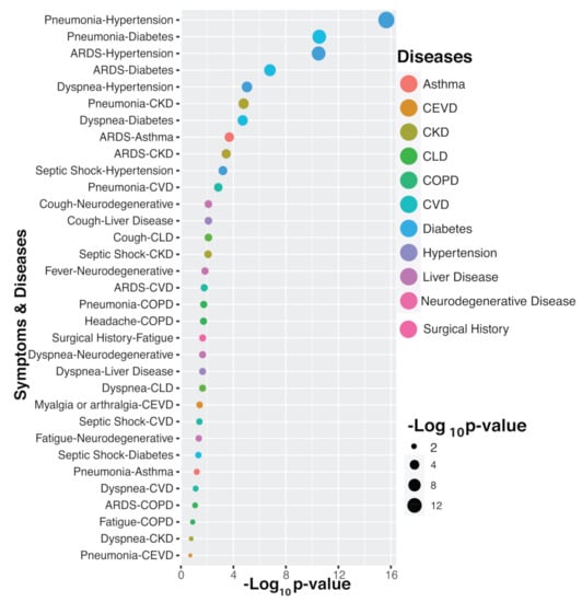 One of the unique findings of this study is the identification of significant pairs of comorbidities and symptoms that are associated with death among COVID-19 patients. For identification of symptom-comorbidity interactions, we applied the Fisher’s exact testing procedure. The negative logarithm of the p-values obtained from the tests is presented in Figure 3. We observed that the symptom–comorbidity combination of Pneumonia–Hypertension, Pneumonia–Diabetes and ARDS–Hypertension had the most significant effects on mortality in COVID-19 patients (Figure 3).