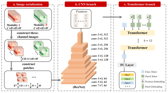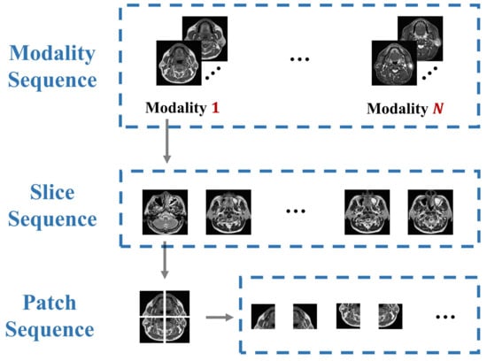 Given a multi-modal image , where spatial resolution is , the depth is D, the number of channels is C, and the number of modalities is N. Before sending it to the CNN encoder, it is necessary to construct the sequence. First, combine the channel dimension, depth dimension, and modality dimension of a multi-modal image to obtain . Then, three adjacent 2D slices of a multi-modal image are superimposed to construct three-channel images . Then, according to [4], each image will be divided into . The larger K value means that the size of each patch is smaller. We will evaluate the impact of different K values on the performance of the model in Section 4. Finally, the image is encoded into a patch .