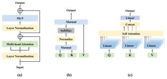 MSA is the core component of the transformer. As shown in Figure 3c, the difference from SA is that the multi-head mechanism splits the input into many small parts, then calculates the scaled dot-product of each input in parallel, and splices all the attention outputs to get the final result. The formula of MSA can be written as follows: