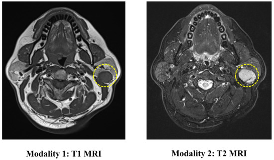 The PGT dataset contains 344 head and neck MRI examinations carried out at the Stomatological Hospital of China Medical University. The ethics board approved the use of the images for this research. This dataset includes two modalities of MRI (T1 and T2), as shown in Figure 4. The ground truth labels are obtained from biopsies.