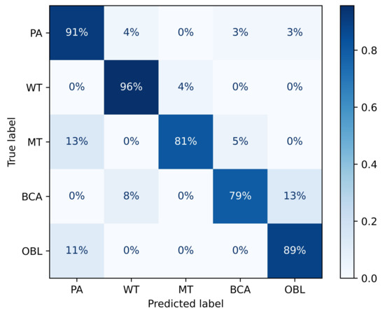 TransMed consistently outperforms previous multi-modal fusion strategies by a large margin. The confusion matrix of TransMed-S is shown in Figure 5, it achieves on average about 10.1% improvement in terms of the average accuracy with respect to the BoTNet, while the larger version TransMed-B slightly suffers from overfitting on the dataset. Table 1 also compares the number of parameters and computational costs between our proposed models and previous methods. TransMed achieves state-of-the-art performance with much fewer parameters and computational costs. TransMed is highly efficient as it models the long-range relationship between modalities very well.