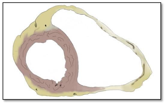 ARVC can be characterized by the abnormal predominance of either adipose tissue or fibro-adipose tissue that replaces the normal RV myocardium. Regardless of the pathological form, this myocardium replacement can be associated with several other entities, such as RV dilation, RV or RV outflow tract (RVOT) aneurysm, concomitant impairment of the left ventricle, presence of inflammatory infiltrates in the ventricular myocardium, and even dilation of the right atrium [13,14,15,16,17,18,19,20]. Of note is the fact that lesions are initially limited at the subepicardial level and later progress towards the endocardium, with the impairment of the entire ventricular wall (Figure 1). This explains why incipient forms are described in patients without any symptoms but with alterations of the subepicardial ventricle [21].