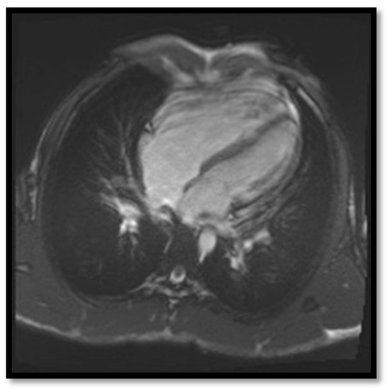 Although Marcus et al. proposed New Task Force Criteria for the diagnosis of ARVC in 2010 [12], neither right atrium nor left ventricular involvement were included as diagnostic elements. To verify the presence of left ventricular involvement, El Ghannudi et al. performed cardiac MRI in 21 patients with ARVC. A 1.5 Tesla Siemens MR system was used with Cine MR in axial sections to evaluate the left ventricle. The end-systolic and end-diastolic volumes of the LV, the ejection fraction, and the presence of late gadolinium enhancement after intravenous administration were assessed. The criteria used to quantify LV damage were LVEF < 55%, the presence of late gadolinium enhancement, LV dilation with an end-diastolic volume of >95 mL/sqm, or the presence of wall motion abnormalities. Of the 21 patients, 7 (33%) with ARVC had left ventricular dilation, 5 patients (24%) had a reduced LV ejection fraction <55%, and 4 patients (19%) had segmental contraction abnormalities of the left ventricle. At the same time, 3 out of 21 patients (14%) had late gadolinium enhancement, although they had no history of myocarditis or coronary heart disease. In conclusion, 52% of all patients had some form of LV impairment [53]. Figure 7 illustrates the left ventricular involvement in an ARVC patient.