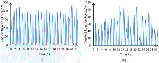 (a) illustrates VRF data captured by the sensors placed on the left foot of a subject declared healthy in the dataset; (b) illustrates VRF data captured by the sensor when placed in the same location on a Parkinson’s patient.