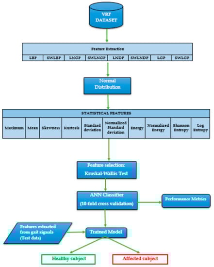 - Statistical features were derived and analyzed, and the statistical Kruskal–Wallis test was carried out for the selection of an optimal feature set. The classification was then carried out by ANN for the identified feature set.