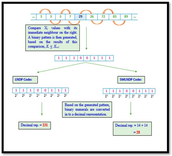 The reduction in the limits of the range between the two sets of techniques symbolizes the difference in the ability to detect and uniquely present the features. Given the shrunken range in symmetrically weighted patterns, a set of trends are clustered into the same group, unlike in the traditional techniques. Therefore, reducing the uniqueness by a safe standard ensures that the noise in the gait signal is disregarded. Algorithm 3 elaborates the procedural representation of LNDP and SWLNDP pattern technique and Figure 5 depicts both LNDP and SWLNDP techniques.