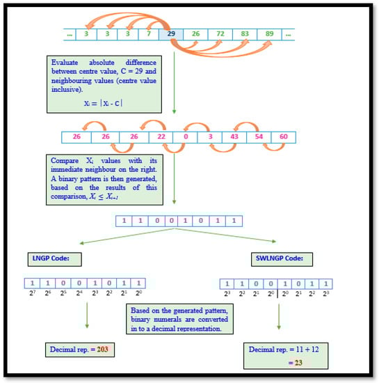 The LNGP technique is derived from LBP. The illustration demonstrated in Figure 6 associates phases from both LGP and LNDP. On combining these implementations, the LNGP technique sensitizes any minute local variations within the region being processed, in turn, capturing minor as well as major global variations in the signal being processed. Though this may be considered an advantage from certain perspectives, this may be a hindrance when extracting statistical features to determine the disparities between the records of healthy subjects versus the affected. Hence, the inclusion of SWLNGP was considered a necessity, as in all previously discussed algorithms. Thus, SWLNGP reduces the sensitivity of the algorithm and ensures that only vital changes in the signal data are captured. This contributes towards the efficient distinguishability of a distribution of values produced by gait signals of a healthy subject versus the distribution of values of an affected subject. The illustrations of LNGP and SWLNGP code are shown in Figure 6. Algorithm 4 illstrates the steps involved in computing LNGP and SWLNGP technique.
