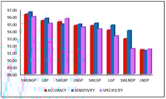 Figure 8 compares the three major performance metrics, accuracy, sensitivity, and specificity, during the second classification phase, involving the revised feature set. However, the primary reason for the rapid increase in performance is the SWLNGP algorithm. This algorithm can identify both local and global variation within the gait signal, which balances out the effects of noise. Therefore, the algorithm contributes heavily towards the achievement of an accuracy of this magnitude.