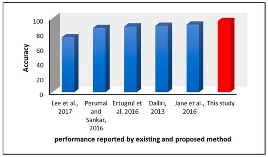 The accuracy obtained in this study is greater than the results obtained by [3,4,29,30,34] and is represented in Figure 8 and Table 9.