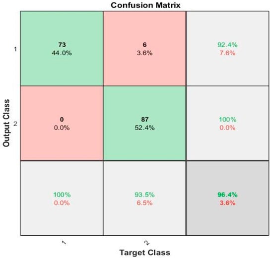 The confusion matrix for the proposed local pattern-transformation-based feature extraction technique for recognition of Parkinson’s gait signals is shown in Figure 10.