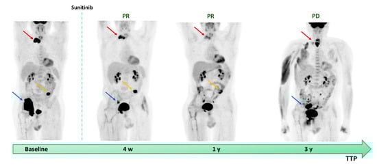 A 52 year-old man affected by metastatic RAI-R DTC. The patient underwent [18F]FDG PET/CT before starting “off-label” Sunitinib therapy. The baseline PET showed high uptake in the transverse process of D1 (red arrow), left iliac wing (yellow arrow), and in the right hip, involved adjacent soft tissue (blue arrow). The patient first underwent right hip resection and reconstruction with a graft, then started MKI therapy and repeated PET exam after 28 days from the starting of Sunitinib with partial response. No AEs were reported and the patient continued target therapy. The one-year follow-up showed a significative response to Sunitinib therapy and a time to progression of three years. PR = partial response; PD = progression disease; w = week; y = year; TTP = time to tumor progression; RAI-R = refractory radioactive iodine; [18F]FDG PET/CT = 2-deoxy-2-[18F]fluoro-D-glucose positron emission tomography/computed tomography; MKIs = multi-kinase inhibitors; AEs = adverse events.