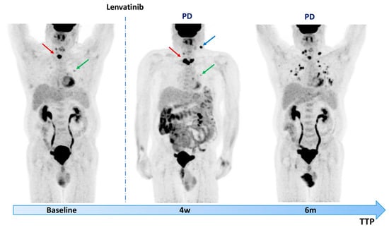 A 63-year-old man with metastatic RAI-R well-differentiated follicular cell thyroid cancer underwent [18F]FDG PET/CT before starting lenvatinib therapy. Baseline PET showed an intense FDG uptake in the paratracheal region, corresponding to locoregional disease and moderate uptake in the bilateral pulmonary field. The patient then underwent reevaluation after 28 days from the beginning of MKI therapy, which showed disease progression with the appearance of a metastatic submandibular lymph node. After surgical lymph node resection, the patient continued lenvatinib therapy with disease progression 6 months later. PD = progression disease; w = week; m = month; TTP = time to tumor progression; RAI-R = refractory radioactive iodine; [18F]FDG PET/CT = 2-deoxy-2-[18F]fluoro-D-glucose positron emission tomography/computed tomography; MKIs = multi-kinase inhibitors.