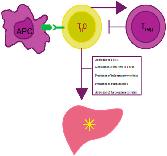 Mechanism of AIH development. APC—antigen presenting cell, Treg—regulatory T cell, Th0—T helper cell. Own elaboration based on [16]. Antigen presentation by APC cells to Th0 lymphocytes leads to effector mobilization on Treg cells and proinflammatory cytokine production. The cytokines stimulate antibody maturation and production by B lymphocytes and inhibit Treg lymphocyte activity. The decrease in the number of Treg lymphocytes leads to the impairment of tolerance to autoantigens, which, in turn, results in the initiation and persistence of autoimmune liver damage.
