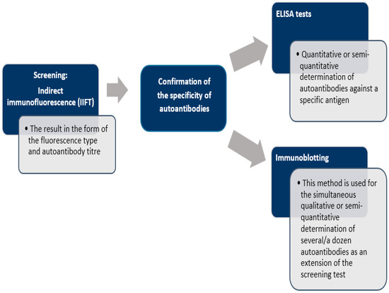 There is no single test that allows definitive diagnosis of AIH. The diagnosis is based solely on a combination of clinical, serological, biochemical, and histological findings. One of the most important diagnostic criteria for autoimmune hepatitis is the presence of serum autoantibodies, which can be detected by such methods as: indirect immunofluorescence technique (IIFT) [103], enzyme-linked immunosorbent assay (ELISA) [104] or immunoblotting [105] (Figure 2). Laboratory tests demonstrate hypergammaglobulinemia and a selective increase in IgG, sometimes a slight increase in IgM, elevated transaminase activity, especially of alanine aminotransferase (ALT) and aspartate aminotransferase (AST), usually 5-fold above normal values. Sometimes, in advanced stages of the disease, increased bilirubin and hypoalbuminemia are observed. The levels of cholestasis markers—alkaline phosphatase (ALP) and gamma-glutamyltransferase (GGTP)—are usually normal or slightly elevated. Other causes of hepatitis should be carefully ruled out, especially alcohol, drugs or viruses.