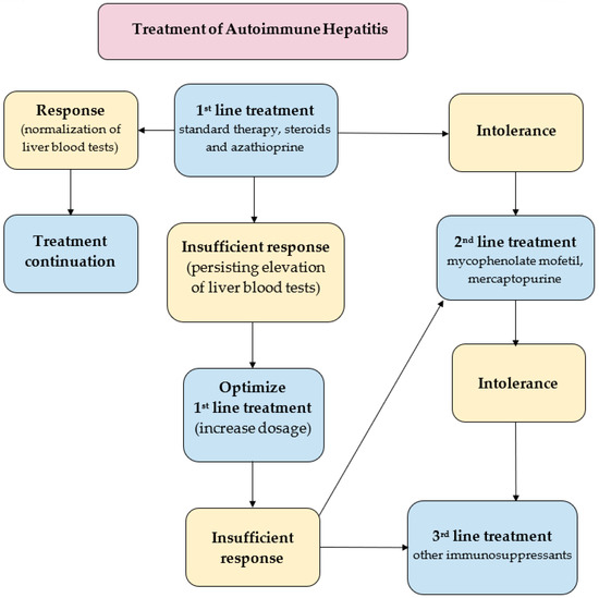 - Vierling, J.M.; Kerkar, N.; Czaja, A.J.; Mack, C.L.; Adams, D.; Assis, D.N.; Manns, M.P.; Mayo, M.J.; Nayfeh, T.; Majzoub, A.M.M.; et al. Immunosuppressive treatment regimens in autoimmune hepatitis: Systematic reviews and meta-analyses supporting American Association for the Study of Liver Diseases guidelines. Hepatology 2020, 72, 753–769. [Google Scholar] [CrossRef] [PubMed]