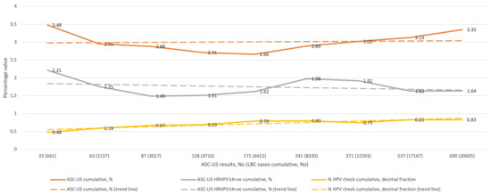 Figure 1 shows the cumulative percentage of ASC-US diagnoses in relation to all LBC diagnoses (upper curve) in the subsequent QA/QC rounds, the cumulative percentage of HRHPV14-positive ASC-US diagnoses in relation to all LBC diagnoses (middle curve), and the cumulative percentage of HRHPV14-positive ASC-US diagnoses (presented as a decimal) over all ASC-US diagnoses (lower curve), and the corresponding trend curves. The lowest cumulative percentage of ASC-US diagnoses was 2.66% and the highest was 3.48%, and all values were between the 10th and 50th percentile reported by CAP-accredited laboratories for SurePath LBC preparation. The cumulative percentage of HRHPV-positive ASC-US for the entire study was 1.64% of all the LBC diagnoses, and for ASC-US diagnoses it was 48.86%.