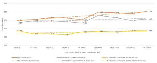 Figure 2 shows the cumulative percentage of LSIL diagnoses in relation to all LBC diagnoses in the subsequent QA/QC rounds (upper curve), the cumulative percentage of HRHPV14-positive LSIL diagnoses in relation to all LBC diagnoses (middle curve), and the cumulative percentage of HRHPV14-positive LSIL diagnoses (presented as a decimal) relative to all LSIL diagnoses (lower curve), and the corresponding trend curves. The lowest cumulative percentage of LSIL diagnoses was 1.51% and the highest was 2.04%, and all values were between the 25th and 50th percentile reported for the SurePath LBC preparation. The cumulative percentage of HRHPV-positive LSIL for the entire study was 1.57% of all LBC diagnoses, and for LSIL diagnoses it was 77.17%.