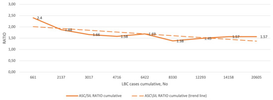 Figure 3 shows the cumulative ratio of ASC to SIL diagnoses, and the corresponding trend curve in the subsequent QA/QC rounds. The lowest ASC/SIL ratio was 1.38 and the highest was 2.4, and all values were between the 25th and 75th percentile (most below 1.8, i.e., between the 25th and 50th percentile) reported for the SurePath LBC preparation. The cumulative ASC/SIL ratio for the entire study was 1.57.
