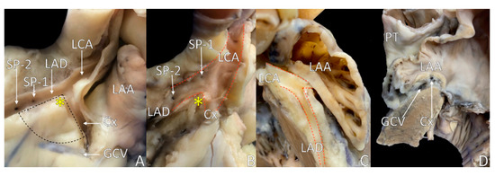 The left circumflex coronary artery, together with the accompanying left lateral cardiac nerve, forms the mitral (or inferior) boundary of the LVS. In the distal sector of the mitral margin, the small section of the great cardiac vein is also present (Figure 1) [25]. In some cases, the circumflex coronary artery is accompanied by the conus vein, which trespasses under the trunk of the left coronary artery (Figure 2A,B). The length of the mitral margin is equal to the length of the septal margin. This margin neighbors close to the mitral annulus (thus the name of the margin), left fibrous trigon, left atrium and the left atrial appendage base [19]. The left atrial appendage overlaps the mitral margin, most commonly covering around 80% of its length, but this may vary depending on the left atrial appendage body type (shape) [26].