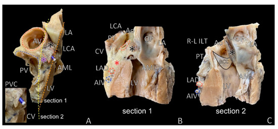 Photographs of the same cadaveric heart specimen dissected at two different levels showing spatial relationships between left ventricular summit (LVS), coronary vessels and aortic valve components. (A) Block of heart showing section lines through the LVS area; (B) Section 1, cut through the anterior interventricular groove (along the LVS septal margin); (C) Section 2, cut through the septal summit and the left coronary cusp of aortic valve. Violet asterisk = septal summit, black asterisk = aortic–mitral continuity, red asterisk = inaccessible area, Ao = aorta, AIV = anterior interventricular vein, AML = anterior mitral leaflet, AV = aortic valve, CV = conus vein, LA = left atrium, LAD = left anterior descending artery, LCA = left coronary artery, LV = left ventricle, OF = oval fossa, PT = pulmonary trunk, PV = pulmonary valve, PVC = posterior vein of conus, R-L ILT = right–left interleaflet triangle, RCC = right coronary cusp.