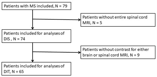 Overall, the cohort included 79 patients diagnosed with RRMS or CIS. Five patients did not have complete spinal cord MRI performed and were consequently excluded from analyses. Two of the spinal cord MRI scans were performed six months later than brain MRI but showed no change from previous (pre-study) spinal cord MRI and were included. Nine patients did not receive contrast for either brain or spinal cord evaluation and were excluded from DIT analyses (Figure 1).
