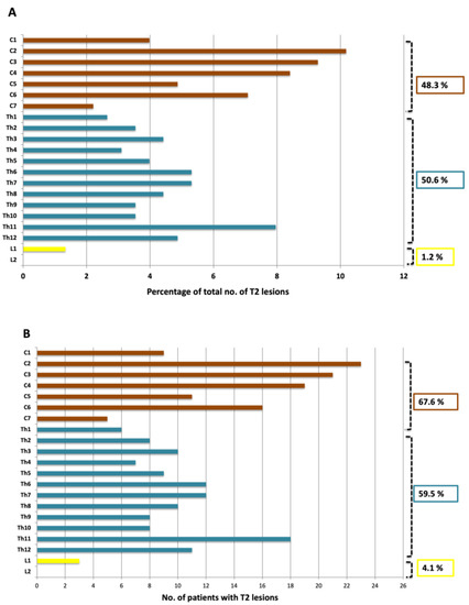 (A) Segmental distribution of T2 lesions in the cervical, thoracic and lumbar spine; (B) Distribution of patients with lesions in the cervical, thoracic and lumbar spine.