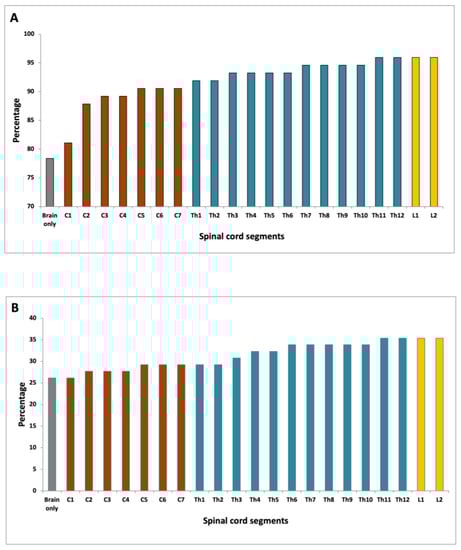 (A) Fulfillment of DIS according to the spinal cord level evaluated; (B) Fulfilment of DIT according to the spinal cord level evaluated.