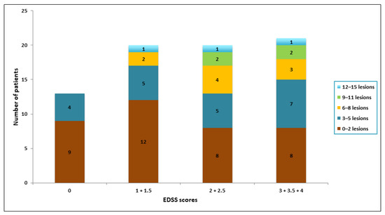 Stratifications of the number of spinal cord lesions and EDSS scores are shown in Figure 5. The median EDSS scores of the patients within each interval of lesions were: 1.5 (0–2 lesions), 2 (3–5 lesions), 2 (6–8 lesions), 2.75 (9–11 lesions) and 2.5 (12–15 lesions). There was no statistically significant difference between the EDSS score for these groups (p = 0.710).