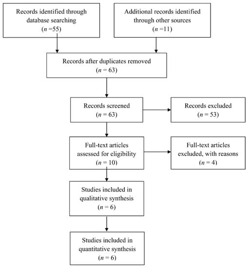 The initial search of the online databases yielded 55 articles, while the additional search of grey literature provided 11 more. Following removal of duplicate records, 63 articles were screened based on their title and abstract. This process resulted in 10 articles eligible for full-text analysis. Among them, one article was excluded due to lack of histological data on the patients, two more were excluded due to lack of clear clarification of how the final diagnosis was confirmed for every patient and finally, one article was excluded because it included only six patients. Ultimately, six articles [14,15,16,17,18,19] were selected for inclusion in the qualitive and quantitative analysis (Figure 1).