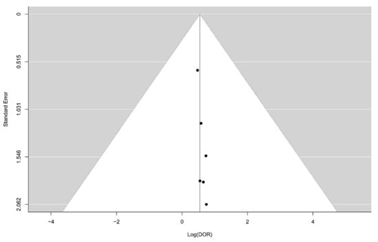 Funnel plot with pseudo 95% confidence intervals, using data from the six studies, with log-diagnostic-odds-ratios displayed in the horizontal axis, indicating that there was probably no publication bias in the included studies.
