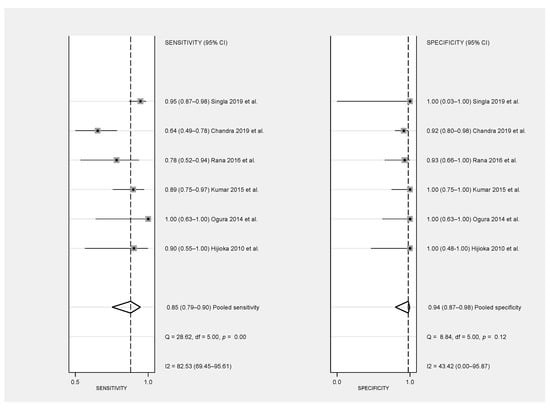 Forest plot showing study-specific [15,16,17,18,19] and pooled sensitivity and specificity with corresponding heterogeneity statistics.