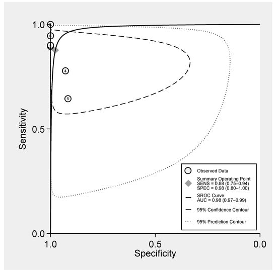 The pooled sensitivity of FNAC was 0.85 (0.79–0.95, 95% CI), with a large heterogeneity among studies (Q = 28.62, I2 = 82.53 and p = 0.00) and the pooled specificity was 0.94 (0.87–0.98, 95% CI) with a low heterogeneity among them (Q = 8.84, I2 = 43.42, p = 0.12) (Figure 3). The designed SROC curve yielded an AUC of 0.98 (0.97–0.99, 95% CI), indicating a very high diagnostic accuracy of the FNAC (Figure 4).