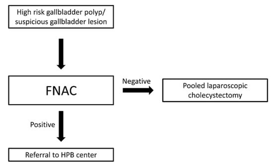 Despite being well-documented in the literature efficiency of FNAC in the evaluation of gallbladder malignancies, it is still not clearly included in the current guidelines of diagnosis and management of gallbladder polyps and malignancies [1,9,11]. According to these guidelines, investigating of a suspicious gallbladder mass includes multiphasic abdominal and pelvic computed tomography and magnetic resonance imaging with intravenous contrast, as well as evaluation of tumor markers, such as CEA and CA 19-9 and diagnostic laparoscopy in cases of suspicion of an irresectable tumor [9]. Biopsy is also only indicated in cases where imaging findings suggest irresectability of the tumor [9]. Moreover, currently suspicious gallbladder polyps are managed with laparoscopic cholecystectomy and post-operative histopathologic evaluation without further pre-operative investigations [11]. Laparoscopic cholecystectomy, especially when it is performed for the treatment of gallstone disease, is an operation that is usually carried out by general surgeons but is also performed by colorectal surgeons, upper gastrointestinal surgeons, hepatopancreatic biliary (HPB), oesophago-gastric, breast and vascular surgeons based on the largest United Kingdom’s audit (CholeS study) [21]. This procedure also plays an integral part in the training and development of operative skills of surgical trainees [22] as it is one of the first procedures that surgical residents gain competence in and become able to perform independently [23]. Based on the findings of our study and the importance of early recognition of gallbladder cancer and appropriate surgical approach, which requires expertise in order to avoid intraoperative perforation of the gallbladder to prevent peritoneal spreading and potentially perform a more complex operation to achieve complete oncologic resection and provide the patient with the optimal outcome and the highest survival rate possible, we propose a modification to the current guidelines of the management of gallbladder polyps and other suspicious lesions. When a patient is diagnosed with a gallbladder polyp that is symptomatic and/or deemed ‘suspicious’ according to the current criteria (size over 10 mm or size 6–9 mm and one more risk factor), or with another suspicious lesion (such as gallbladder thickening) instead of the patient being referred directly for a laparoscopic cholecystectomy, we suggest that the polyp is further investigated with FNAC. The procedure can be performed either under transabdominal or endoscopic ultrasound guidance depending on the availability and expertise of the involved center, as it carries a similar (minimal) complication rate [24,25]. If the FNAC is positive or suggestive of malignancy, then we suggest that the patient should be referred to hepatobiliary (HPB) surgeons in a center with high level of expertise in the field for further investigation and management. Otherwise, the patient can be referred for a routine laparoscopic cholecystectomy in a pooled waiting list, without further investigations required (Figure 5). However, based on the NPV of the included studies that ranged from 0.2 to 1.0 (average 0.71), there is still an almost 30% chance of patients with gallbladder carcinoma being referred to a pooled waiting list. Therefore, other groundbreaking diagnostic modalities that have not yet been included in the guidelines of management of GBC but have already shown very promising outcomes should be investigated further to facilitate a more thorough diagnostic approach of gallbladder tumors, especially in cases of negative FNAC.