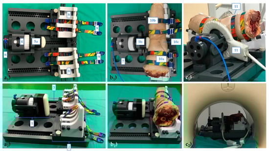 Experimental setup used for in-situ imaging of knee joints under valgus loading. Top (a1,b1) and side views (a2,b2) of the loading device without (a) and with (b) a representative (right-sided) knee joint. The loading device consists of a loading (1) and holding unit (2) that are both attached to the rigid base plate (3). The pneumatic unit (4) actuates the padded load applicator (5a—not pressurized, 5b—pressurized) which is aligned along the joint line and connected to the in-house pressure supply via a pressure port (6) and respective pressure lines (7). The holding unit standardizes joint position at 30° of flexion by two quarter-pipe wedges (8). Fixation is provided by two tourniquets (9) at the level of the thigh (10a) and lower leg (10b), while the popliteal fossa (10c) is not fixed. Fully operational setup with two flexible dual-coils positioned in lateral orientation to the knee (11) outside (c1) and inside (c2) a clinical 3.0T-MRI scanner.
