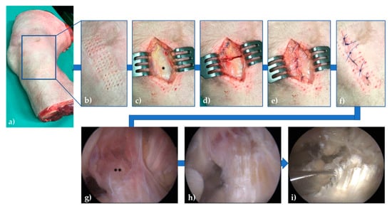 Standard knee joint arthroscopy to transect the ACL was performed by SN (common trunk-trained orthopedic surgeon). The joint was accessed through the anteromedial and anterolateral portals. Then, the ACL was identified (Figure 2g), cautiously synovectomized for full visualization using a 4.5-mm full radius shaver (Dyonics, Smith & Nephew, Andover, MA, USA) (Figure 2h), and completely cut at its mid-substance using arthroscopic straight-tip scissors (Arthrex, Naples, FL, USA) (Figure 2i). Last, any excess fluid was removed, and the skin incisions were sutured, too.