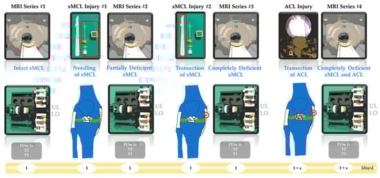 Timeline of MRI series and graded injuries. Sequentially, the superficial medial collateral ligament (sMCL) was partially injured, i.e., needled (sMCL injury #1), and completely injured, i.e., transected (sMCL injury #2). The anterior cruciate ligament (ACL) was transected (ACL injury). Consequently, the knee joints were imaged in the sMCL-intact condition (MRI series #1), partially sMCL-deficient condition (MRI series #2), completely sMCL-deficient condition (MRI series #3), and the combined sMCL- and ACL-deficient condition (MRI series #4). MRI series refer to the imaging protocol (grey boxes) that was completed for each joint in the unloaded (UL) and loaded (LO) configurations. Unit of timeline is days (yellow).