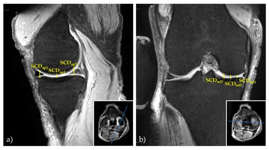 Example manual 2D reference measurements of subchondral cortical distances in the medial compartment. Visualized are the mid-sagittal (a) and mid-coronal (b) images of the Proton Density-weighted fat-saturated sequences and inset boxes to indicate their orientation. Subchondral cortical distances are indicated by yellow lines as the vertical distances between the femoral and tibial subchondral cortices at three locations along the anteroposterior (SCDap1 to SCDap3 [a]) and mediolateral dimensions (SCDml1 to SCDml3 [b]).