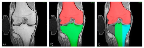 Manual segmentation procedure. For each joint, configuration, and condition, the coronal images of the T1-weighted sequence (a) were manually segmented and labelled as femur (red) and tibia (green) (b). The tibia was further compartmentalized into the medial (turquoise) and lateral (grey) tibial condyles and the intercondylar eminence was spared (c).