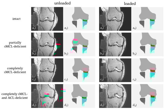 Loading-induced changes in the medial compartment as a function of graded knee joint ligament injury in a representative knee joint. Displayed are T2-weighted mid-coronal images (a1–d1,a3–d3) and corresponding (coronal) visualizations of the 3D knee joint models (a2–d2,a4–d4) in the unloaded (a1–d1,a2–d2) and loaded (a3–d3,a4–d4) configurations and the indicated joint conditions. Color codes are as follows: femur (light grey), tibia (turquoise [medial compartment] and dark grey [lateral compartment]). Vertical red lines indicate individual measurements of subchondral cortical distances. sMCL—superficial medial collateral ligament. ACL—anterior cruciate ligament.