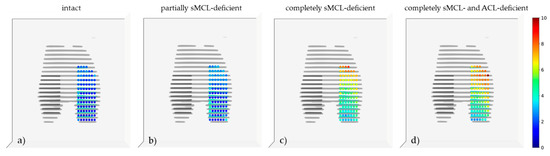 Spatially resolved quantification of medial compartment opening under loading as a function of graded knee joint ligament injury in all knee joints. Displayed are the loading-induced differences in the medial compartment’s subchondral cortical distances (SCD) for the unloaded versus loaded configurations and as a function of joint condition, averaged over all knee joints. (a) Intact, (b) partial sMCL deficiency, (c) complete sMCL deficiency, (d) combined sMCL and ACL deficiency. For example, “intact” visualizes the changes of the SCD values of the loaded versus the unloaded configuration. Axial views. Each color-coded dot represents a single SCD measurement along the pre-specified grid. The unit of the continuous colour scale on the right is [mm]. The sliced appearance is due to interslice gaps following axial image reconstruction. Abbreviations and color codes of bone outlines as in Figure 6.